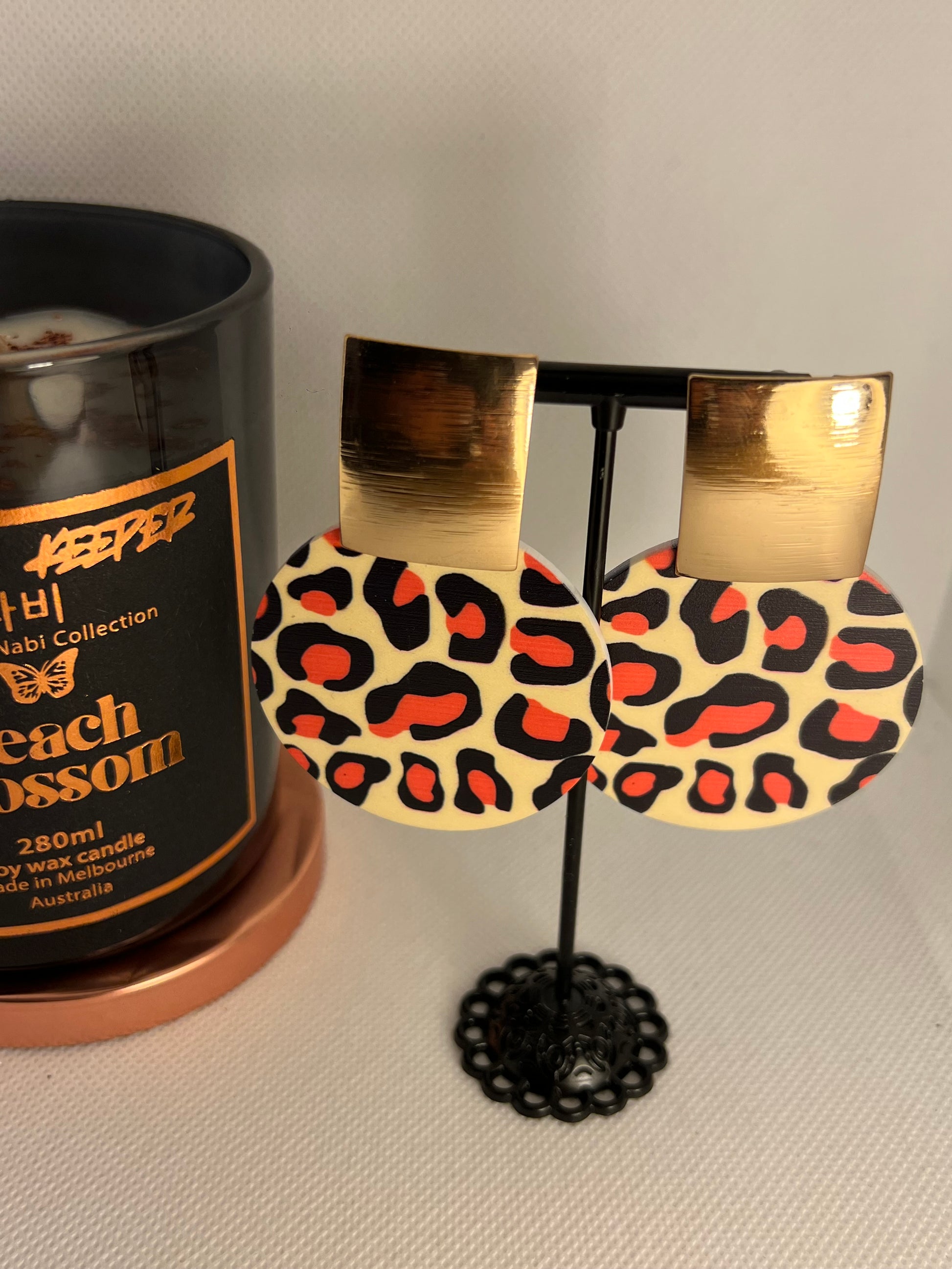 Gold plated stud with cheetah print drops. statement piece for the bold. Available in limited stock.